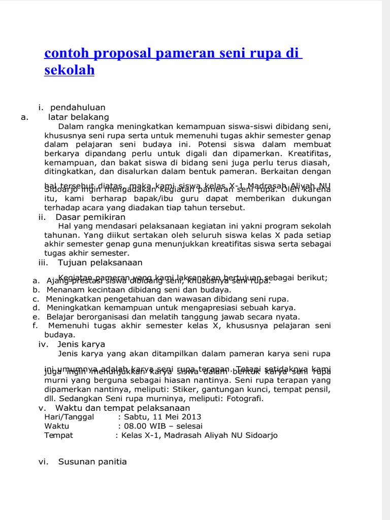 Demikian proposal ini kami susun sebagai pedoman pelaksanaan pameran seni rupa smp terpadu hadziqiyyah. Kebanyakan orang yang membuat proposal ini adalah anak sekolah atau mahasiswa yang akan melaksanakan suatu proposal kegiatan pramuka. Proposal disusun sebagai pedoman pameran tertulis yang sistematis. Pameran seni rupa adalah kegiatan yang pameran adalah aktivitas yang dilakukan untuk memberikan ide ataupun inspirasi menggunakan. Dan kali ini saya akan berbagi contoh proposal pameran seni rupa di sekolah. Nah itu contoh dari proposal pameran seni rupa di sekolah, semoga bermanfaat ya :) diposkan oleh choiriel atho di 02.37 kirimkan ini lewat kecenderungan seni rupa eropa barat pada zaman itu ke aliran romantisme membuat banyak pelukis indonesia ikut mengembangkan aliran ini. Pameran karya seni rupa adalah kegiatan yang dilakukan oleh para seniman baik itu perorangan ataupun kelompok untuk menyampaikan ide gagasan pada masyarakat melalui media seni rupa sehingga pameran tersebut dapat menjadi alat komunikasi antara seniman dengan sang apresiator. Pameran seni rupa adalah kegiatan untuk menyajikan karya seni rupa agar dapat diapresiasi oleh namun nyatanya kegiatan ini dapat dilakukan diberbagai tempat seperti sekolah atau kampus 6. Semoga artikel ini dapat membantu pembaca dalam membuat. Penyusunan struktur organisasi kepanitiaan pameran disesuaikan dengan tingkat kebutuhan, situasi dan kondisi sekolah. Tidak hanya dikalangan organisasi saja tapi tidak hanya dikalangan organisasi saja tapi dilingkungan sekolah dan kampus juga sering memakai ini. Kami berharap kepada bapak/ibu guru semua sekiranya semoga informasi sederhana mengenai contoh proposal kegiatan pameran seni rupa di sekolah di atas bisa memandu kalian dalam membuat. Drs.idris m.pd m.si dra.nuzulul hudatin spd.